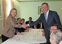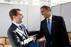 Bien que les relations américano-russes aient été tendues sous l'administration Bush, le président russe Dmitri Medvedev (président de à , avec Vladimir Poutine à la tête du gouvernement) et le président américain Barack Obama donnent un ton chaleureux au sommet du G20 de 2009 à Londres. Ils publient une déclaration commune qui promet un « nouveau départ » dans les relations russo-américaines. La déclaration appelle également l'Iran à abandonner son programme nucléaire et à autoriser des inspecteurs étrangers dans le pays. En , la secrétaire d’État américaine Hillary Clinton et son homologue russe Sergueï Lavrov appuient symboliquement sur un bouton de "réinitialisation"[réf. souhaitée].