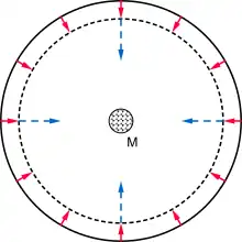 La théorie de la relativité générale ne donne pas une représentation immédiate et évidente de ce phénomène[19]. Le tenseur énergie-impulsion ne donne que l'énergie d'un corps ou d'un champ non gravitationnel en un point, sans tenir compte de l'énergie du champ de gravitation en ce point. L'énergie des ondes gravitationnelles n'est donc pas représentée par ce tenseur, et sa dérivée covariante nulle ne représente pas la conservation globale de l'énergie. Pour représenter une énergie du système « corps-champ de gravitation » se conservant, Einstein a exprimé l'énergie du champ par un « pseudo-tenseur (en) » qui s'annule pour un choix de référentiel en chute libre (inertiel) au point considéré : l'énergie du champ de gravitation n'existe qu'en fonction du référentiel choisi[17]. Ce « pseudo-tenseur », tiré du tenseur de Ricci, exprime aussi l'auto-corrélation du champ sur lui-même, ce qui explique sa formulation assez compliquée. En particulier, l'énergie émise sous forme d'ondes gravitationnelles s'exprime à l'aide de ce « pseudo-tenseur ».