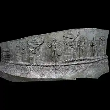 | III | Le rivage est devenu abrupt mais quelques arbres parviennent à pousser entre les rochers. En arrière, la ville continue de s'étendre, riche en monuments. L'un d'entre eux est bien visible au centre, le rez-de-chaussée pourvu d'arcades. Les épaisses murailles de la ville, construites en pierre de taille et couronnées de créneaux, sont percées de plusieurs portes cintrées. Au milieu, assis dans une grotte sur le bord du Danube, la divinité associée au fleuve, le dieu Danuvius ou Ister, la tête ceinte de plantes aquatiques, observe l'armée romaine qui sort de la ville[32]. |