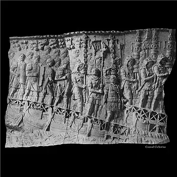 L'armée traverse un gué Les légionnaires passent un torrent bordé de chênes à gué, précédés des porte-étendards de manipule et du bucinator. Un des légionnaires s'est dévêtu et traverse avec ses vêtements et ses armes sur le bouclier qu'il porte au-dessus de sa tête[45],[46]. L'empereur, accompagné de l'aquilifer, ont déjà gagné la rive opposée. Distribution des récompenses Tout à fait à droite, Trajan et un de ses lieutenants, montés sur une estrade, s'adressent aux soldats qui se sont amassés face à la tribune. Trajan tient dans sa main droite une lance (disparue) qui sera offerte au général qui s'est le plus distingué durant les combats. |