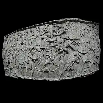 | XLII | Bataille d'Adamclisi[a 6] La cavalerie romaine engage le combat contre les Daces qui ont pris position sur une colline, tandis que les légions attaquent de front, soutenues par des auxiliaires germains. L'armée dace, défaite, tente de fuir à travers les bois. Le chemin est couvert de morts et de blessés. |