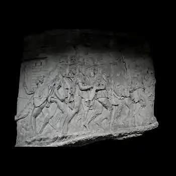 Donativa Trajan, entouré de son état-major, assis sur un siège pliant (stella castrensis), distribue des décorations aux soldats auxiliaires qui se sont illustrés au combat[57]. Le soldat qui vient d'être décoré exprime sa reconnaissance et embrasse la main de l'empereur. En dessous, ses camarades le félicitent. Prisonniers romains À droite, trois prisonniers romains, nus, sont soumis au supplice des torches par des femmes daces[45],[58]. |