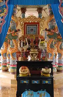 Cao Đài , littéralement le "palais suprême",[23] est la plus haute divinité, souvent identifiée à l'empereur de Jade, qui a créé l'univers[25][page à préciser]. Il est vénéré dans le temple principal, mais les caodaïstes vénèrent aussi la Déesse Mère, aussi connue sous le nom de Reine-mère de l'Ouest. Le symbole de la foi est l’œil Gauche de Cao Đài, représentant l'activité dương (yang) du mâle créateur, qui est balancée par l'activité âm (yin) de la Déesse Mère féminine et nourricière de l'humanité[2],[21].
