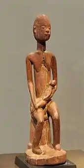 La distinction entre sacré et profane n'existe pas dans une culture africaine profondément imprégnée de la religion traditionnelle africaine[48],[note 9] car les ancêtres et les morts, « forces spirituelles, participent fondamentalement à la réussite ou à l’échec des entreprises humaines[50] ». On trouve donc des rites centrés autour des représentations matérielles des forces spirituelles susceptibles d'intervenir dans le monde humain et, notamment, les masques et les statues (les idoles ou fétiches dans l'acception désormais dépassée) qui fascinèrent (et fascinent encore) les Occidentaux[51]. Ils sont destinés à invoquer ces forces spirituelles[note 10],[53].
