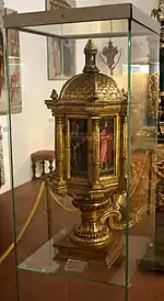 Sur le coin gauche inférieur (cliquer pour agrandir), une statuette de la Vierge dont l'inscription mentionne qu'elle contient une relique du lait de la Vierge[32].