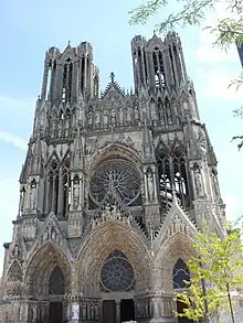 « Auprès du dict tabernacle, est conservée une grande image[Note 1] de la Vierge, qui se met les jours solennels sur le grand-autel, et qui est portée en processions générales, laquelle est d'argent doré, comme aussi la couronne garnie de pierres et perles, à laquelle y a deux saphirs, et le reste sont des grenats; il y manque cinq perles et quatre pierres au pied; elle tient le petit Jésus dans son bras gauche, qui est d'argent doré, lequel tient une boule d'argent doré, au-dessus de laquelle est une croix de Lorraine[Note 2] ; de même la dite image tient un reliquaire sur sa main droite, dans lequel est du lait de la Vierge[Note 3] ;elle est posée sur un pied de cuivre doré; l'image avec le petit Jésus, le reliquaire et la couronne avec un priant, le tout d'argent doré, pèsent vingt-deux marcs, et le pied de cuivre doré pèse trente marcs. Elle a été donnée par Guillaume de Esternay, chanoine de Reims, comme il se voit par un écriteau qui est sur une lame d'argent émaillée, attachée au pied de la dite image, portant ces mots : Guillelmnes de Estanaye, canonicus Remensis quondàm prœpositus Laudunensis, dedit istam imaginem ecclesiæ Remensi. Orate pro eo.