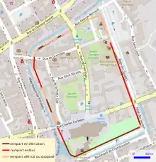 - Des éléments de cette première fortification sont retrouvés sur plusieurs dizaines de mètres à l'est de l'enceinte du Bas-Empire[1].