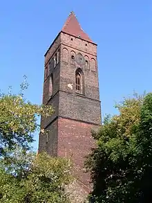 Les remparts de la ville à Lubin – construits au XIVe siècle, probablement comme le remplacement des remblais de terre avec une palissade remplissant la fonction défensive. La période de la construction des remparts la plus intensive couvre les années 1348-1358, les temps de la guerre civile entre les fils de Boleslas III le Prodique, quand Lubin était la résidence du prince Louis Ier de Brzeg. Les remparts ont été incorporés dans le système de défense de la ville dans la seconde moitié du XIVe siècle[1].