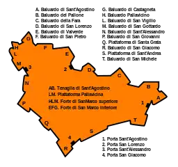 Cette muraille est composée de 14 bastions, 2 étages, 32 échauguettes (dont une seule a été conservée), 100 ouvertures pour les bouches à feu, deux poudrières, 4 portes (Sant'Agostino, San Giacomo, Sant'Alessandro et San Lorenzo, cette dernière étant également connue sous le nom de Porta Garibaldi).