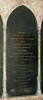 Le , en présence d'une foule nombreuse, le cercueil en cuivre de Descartes est déposé en l'église de l'abbaye Sainte-Geneviève de Paris. M. Dalibert fait réaliser un monument de marbre mis en place en 1669, portant deux inscriptions, une en latin attribuée au Père Lallemant, l'autre en vers français composée par Gaspard III de Fieubet[36].