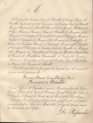 Faire-part de décès concernant Amour Louis Charles René de Bouillé (1802-1882)
