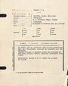 - Ministère de l'Intérieur, Français : Dossier au nom de Renée Marceau dans le Fichier central de la Sûreté nationale. Archives nationales, cote 19940508/1559, dossier 10079., (lire en ligne)