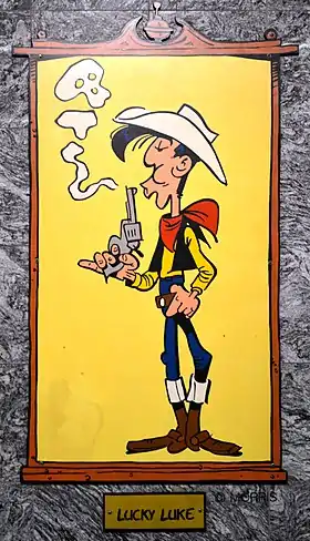 Le dessinateur Morris, qu'il a rencontré en 1948 aux États-Unis par l'intermédiaire de Jijé, le sollicite pour écrire le scénario de Lucky Luke. Des rails sur la prairie, la première aventure scénarisée par Goscinny, paraît dans Spirou en 1955. Après un dernier épisode réalisé par Morris sur un scénario de son frère, Louis De Bevere (Alerte aux Pieds-Bleus)[46], René Goscinny reprend définitivement le scénario à partir de Lucky Luke contre Joss Jamon. Morris a créé son personnage en 1947. Il s'agit, au départ, d'un véritable cow-boy, qui se transforme rapidement en défenseur de la veuve et de l'orphelin[47]. Il tire juste et vite, au point de devenir « l'homme qui tire plus vite que son ombre ». Après quelques années, Morris considère qu'un sang neuf ferait du bien à Lucky Luke. De plus, il apprécie de pouvoir se concentrer exclusivement sur le dessin.