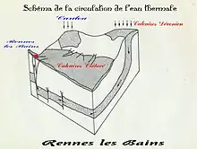 Cependant, selon le site officiel du Pays de Couiza[14], l'origine se trouve dans les calcaires dévoniens constitués durant l'ère primaire, karstifiés du plateau voisin de Mouthoumet. Ces calcaires permettent l’infiltration de l’eau qui est ensuite prise au piège et chauffée en profondeur dans des schistes imperméables constituées de marnes. Celle-ci remonte ensuite vers la surface à la faveur de nombreuses failles. Le déplacement de ces eaux souterraines s'est établi durant 15 milliers d'années.
