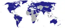 En vert : l'Irlande, en bleu : pays ayant une représentation diplomatique en Irlande.