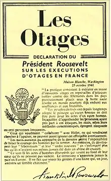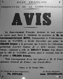 Les directives d'Hitler relatives à l'attentat de Nantes, sont communiquées à Stülpnagel par l'intermédiaire de Wilhelm Keitel et de Walter Warlimont, seront d'exécuter immédiatement de 100 à 150 otages[2]. Stülpnagel applique la directive en publiant, le son AVIS - prévoyant l'exécution immédiate de 50 otages et l'exécution conditionnelle de 50 autres, au cas où les coupables n'auraient pas été arrêtés le [2].