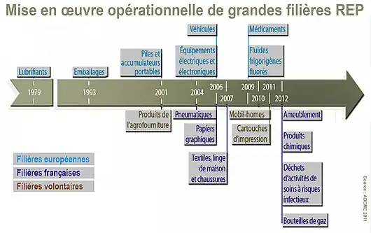 Présentation des grandes filières de responsabilité élargie du producteur (REP), sur une ligne du temps ; d'après les données de l'Ademe en 2011 (d'autres sont ensuite prévues, comme la récupération des bateaux de plaisance en fin de vie). D'autres REP sont à l'étude ou périodiquement évoquées (ex : déconstruction durable des bâtiments)