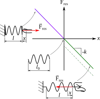 Le ressort a une longueur à vide l0. Si on veut l'allonger (ressort de traction) ou le raccourcir (ressort de compression) d'une longueur x nommée allongement ou élongation, il faut exercer deux forces égales et opposées à ses extrémités ; la force à une des extrémités est orientée dans l'axe du ressort et son intensité vaut , où k est la constante de proportionnalité, appelée « constante de raideur » ou constante de rappel du ressort, exprimée en newtons par mètre (N/m ou N m−1).