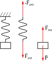Si l'on tire la masse vers le bas et qu'ensuite on la lâche, le système va osciller. Ceci permet d'aborder les oscillations harmoniques et les équations différentielles permettant cette étude.