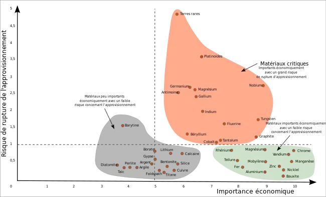 - les matériaux important économiquement mais sans risque immédiat pouvant toucher l'approvisionnement (en bas à droite du tableau) sont ceux qui, par un simple changement de variables peuvent passer dans la catégories des matériaux critiques. L'étude considère que les difficultés d'approvisionnement concernant ces matériaux peuvent apparaitre sur une échelle de temps plus longue.