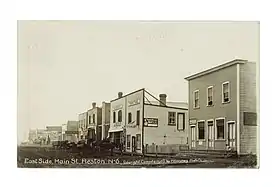 Carte postale de Reston, Manitoba : rue principale de la ville avec plusieurs charrettes tirées par des chevaux garées le long de la rue.