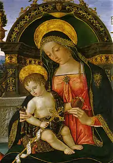 - Sous un dais architecturé à frises d'or la Vierge à l'Enfant est montrée trônant avec le jeune saint Jean-Baptiste à ses pieds ; Jésus tient l'extrémité croisée du bâton richement doré et orné qu'il lui tend, enroulé d'un phylactère et, dans l'autre main, une grenade[4] ouverte laissant voir ses graines rouges.