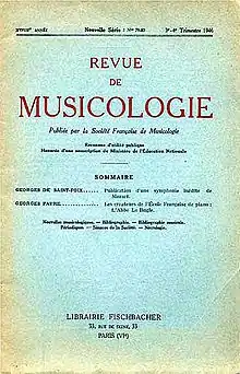 La Revue de musicologie s’installe durablement dans le paysage musicologique, paraissant avec régularité jusqu’à l’approche de la Seconde Guerre mondiale : peu après avoir inauguré une nouvelle typographie sur la couverture (1935), la Revue connaît quelques difficultés de périodicité (1937-1939) jusqu’à un arrêt total de parution en 1940 et 1941. Lors de la reprise de la publication en 1942, le titre change à nouveau: une « série spéciale », hors tomaison, voit le jour[7]. La publication prend, jusqu’en 1945, le titre de Société française de musicologie : Rapports et Communications. Un encart rose est inséré dans le numéro de 1942 : « En raison des événements survenus depuis deux ans, la Revue de musicologie ne pouvant assurer une périodicité régulière, est remplacée momentanément par le présent fascicule de Rapports et Communications, qui, selon les circonstances, sera suivi par d’autres[8]. » Un avis porté en tête du numéro de 1944 éclaire quelque peu les aléas de la Revue dans cette période : « Le numéro unique de 1944 représente à lui seul le tome XXIII de la Revue de Musicologie. Les circonstances ne nous ont pas permis de faire paraître un autre numéro pendant cette année si décisive pour la France et pour l’Europe. Sous le titre de Rapports et Communications, qui nous a été imposé pendant l’occupation allemande, nous avons réussi, malgré une périodicité irrégulière, à maintenir presque intégralement le contenu habituel de la Revue, sauf, naturellement, pour le compte-rendu des publications étrangères. Comme la plupart des revues scientifiques, nous avons accepté provisoirement cette modification de titre pour pouvoir sauvegarder l’existence de notre Société, la continuité de nos séances de travail, et la cohésion d’un groupement de spécialistes laborieusement constitué depuis un quart de siècle, dans une discipline trop négligée en France et pourtant essentielle à la culture française. Avec l’année 1945, notre revue, débarrassée de toute contrainte, encouragée par le gouvernement de la Libération, reprendra son titre de Revue de Musicologie. Elle tâchera de recouvrer une périodicité aussi régulière que le permettront les événements de la vie nationale et internationale[9]. » Le retour à un rythme régulier de parution n’est pas immédiat ; une mention portée dans les pages du tome XXVI affirme en effet : « La Revue de Musicologie, comme beaucoup d’autres revues scientifiques, subit en ce moment des retards dont nous nous excusons mais qui sont dus surtout à la situation économique générale. Pour atténuer ces retards, nous avons réuni en un seul volume la matière des fascicules prévus pour 1947. Mais nos lecteurs n’y perdront rien, bien au contraire, car le nombre de pages de l’année 1947 est très supérieur à celui de 1946[10]. » Un message de même teneur confirme l’année suivante la difficulté de retrouver la périodicité : « La Revue de Musicologie, comme beaucoup d’autres revues scientifiques, subit en ce moment des retards dont nous nous excusons mais qui sont dus surtout à la situation économique générale. Pour atténuer ces retards, nous avons, cette année encore, réunit en un tome (1948) la matière des quatre fascicules trimestriels du temps normal. Nous espérons faire paraître en fin d’année une somme de même importance (1949) et reprendre la périodicité au moins semestrielle[10]. » En 1950 encore : « Nous adoptons, avec le présent numéro, une périodicité semestrielle, en attendant de pouvoir revenir à la périodicité trimestrielle d’avant-guerre. Un second numéro pour 1950 paraîtra donc en fin d’année[11]. Jusqu’en 1953, l’espoir de revenir à une publication trimestrielle se lit en outre dans la double numérotation de chacun des volumes. »