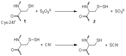 - le thiosulfate S2O32− réagit avec le groupe thiol du résidu Cys-247 (1) pour former un disulfure (2) en libérant un ion sulfite SO32− ;