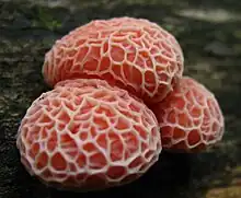 Le sporophore est composé d'un pied dépourvu d'anneau et de volve, et d'un chapeau. Le chapeau est d'abord convexe à l'état jeune, avant de s’aplatir un peu avec l'âge, et il atteint généralement une largeur de 2 à 6 centimètres. Les bords du chapeau sont involutés et la surface de la cuticule est profondément réticulée. Entre les crêtes, la couleur est variable ; selon les conditions d'éclairage pendant son développement, elle peut aller de saumon orangé au rose au rouge. La texture de la cuticule est gélatineuse, et la chair est ferme mais caoutchouteuse, et de couleur rosâtre.