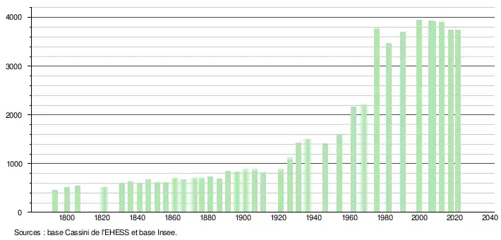 L'évolution du nombre d'habitants est connue à travers les recensements de la population effectués dans la commune depuis 1793. Pour les communes de moins de 10 000 habitants, une enquête de recensement portant sur toute la population est réalisée tous les cinq ans, les populations légales des années intermédiaires étant quant à elles estimées par interpolation ou extrapolation[25]. Pour la commune, le premier recensement exhaustif entrant dans le cadre du nouveau dispositif a été réalisé en 2007[26].
