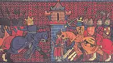 Alors que Richard se retire vers le nord, Saladin lance une contre-attaque et met le siège devant Jaffa le [59]. Saladin prend la ville basse mais pas la citadelle, qui résiste. Mis au courant[60], Richard quitte alors sa flotte, rassemble rapidement une petite armée et se précipite vers la ville. La bataille de Jaffa s'engage. Battu à deux reprises par Richard, les 1er et , Saladin est contraint de se replier vers Jérusalem[61].
