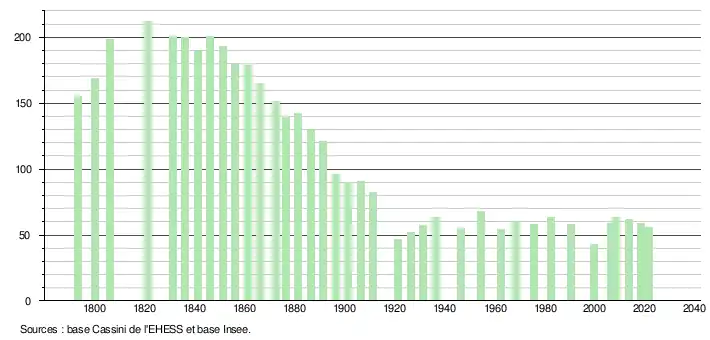 L'évolution du nombre d'habitants est connue à travers les recensements de la population effectués dans la commune depuis 1793. Pour les communes de moins de 10 000 habitants, une enquête de recensement portant sur toute la population est réalisée tous les cinq ans, les populations légales des années intermédiaires étant quant à elles estimées par interpolation ou extrapolation[19]. Pour la commune, le premier recensement exhaustif entrant dans le cadre du nouveau dispositif a été réalisé en 2008[20].
