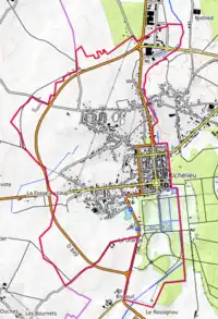- « Le Poteau » : ce lieu-dit, dont le toponyme est probablement associé à un poteau antérieurement planté le long de la route dite de la « Québrie », se situe dans les marges septentrionales de la commune richelaise[3]. En outre, il est distant d'environ 150 mètres de la ville de Champigny-sur-Veude, localisée au Nord, et se trouve longé par la route départementale 749 reliant Chinon à Richelieu, à l'Est[3]. Les cadastres d'époques révolutionnaire et napoléonienne ont été les premiers documents officiels faisant état de ce lieu-dit[3].