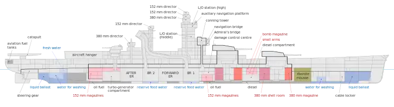 | Blindage | ceinture en acier cémenté Martin de 330 mm (inclinée à 15°24) Premier pont : 24 mm P.B.S. : de 150 à 170 mm P.B.I. : de 40 à 50* mm (*Talus) Tourelles de 380 mm : 430 mm (face avant inclinée à 30°) |