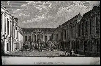 La banqueroute du système de Law en vient rapidement mettre fin à cette réunification. La Couronne récupère l'ensemble des bâtiments et leur donne une nouvelle affectation. L'hôtel Tubeuf et ses dépendances restent affectés à la Compagnie des Indes, la galerie Mansart échoit à la Bourse, la galerie Mazarine, l'hôtel de Nevers et ses dépendances sont assignés à la Bibliothèque royale[16]. Cette dernière est installée depuis 1666 dans des locaux rue Vivienne. Sous l'égide de l'abbé Bignon, elle comprend alors cinq départements : Manuscrits, Estampes, Titres, Médailles et Imprimés. Le déménagement a lieu entre le et [16]. Depuis lors, la Bibliothèque royale ne quittera plus les lieux et tentera de reconstituer l'unité du palais Mazarin sous son institution.