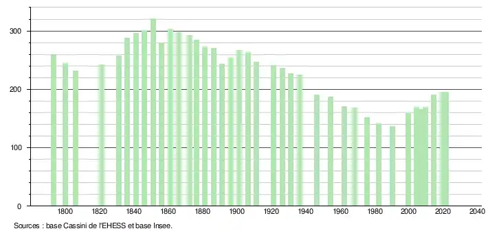 L'évolution du nombre d'habitants est connue à travers les recensements de la population effectués dans la commune depuis 1793. Pour les communes de moins de 10 000 habitants, une enquête de recensement portant sur toute la population est réalisée tous les cinq ans, les populations légales des années intermédiaires étant quant à elles estimées par interpolation ou extrapolation[11]. Pour la commune, le premier recensement exhaustif entrant dans le cadre du nouveau dispositif a été réalisé en 2004[12].