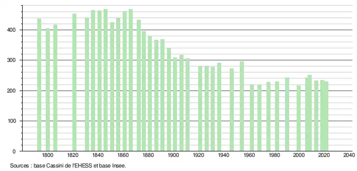 L'évolution du nombre d'habitants est connue à travers les recensements de la population effectués dans la commune depuis 1793. Pour les communes de moins de 10 000 habitants, une enquête de recensement portant sur toute la population est réalisée tous les cinq ans, les populations légales des années intermédiaires étant quant à elles estimées par interpolation ou extrapolation[17]. Pour la commune, le premier recensement exhaustif entrant dans le cadre du nouveau dispositif a été réalisé en 2008[18].