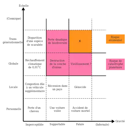 Un risque existentiel est un risque « menaçant l'extinction prématurée de la vie intelligente d'origine terrestre, ou la destruction permanente et drastique de son potentiel pour un développement futur souhaitable »[64]. Une catastrophe existentielle est ainsi un type de catastrophe planétaire particulièrement grave, et ayant des conséquences à très long terme.