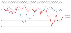 Les deux clubs ont dans leur histoire 20 saisons de partagées, en Division 1 ou en Division 2. Historiquement, les rouennais sont mieux classés que les havrais, mais le rapport de force s'est inversé dans les années 1980[26] où, alors que Rouen tombe en troisième voire quatrième division, le Havre AC participe à 12 éditions de la Division 1, et réalise même une belle série de 9 saisons consécutives en Division 1, entre 1991 et 2000[27].