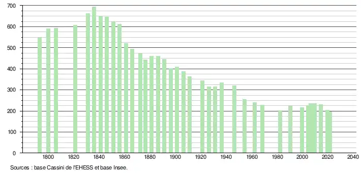 L'évolution du nombre d'habitants est connue à travers les recensements de la population effectués dans la commune depuis 1793. Pour les communes de moins de 10 000 habitants, une enquête de recensement portant sur toute la population est réalisée tous les cinq ans, les populations légales des années intermédiaires étant quant à elles estimées par interpolation ou extrapolation[22]. Pour la commune, le premier recensement exhaustif entrant dans le cadre du nouveau dispositif a été réalisé en 2004[23].