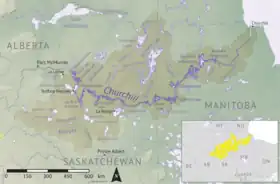Longue de 1 600 km, la rivière Churchill coule dans une série de grands lacs (Churchill, Highrock, Granville, Southern Indian et Grauer) jusqu'à la ville de Churchill, sur la rive occidentale de la baie d'Hudson. Son bassin versant naturel s'étend sur 283 000 km2 et son débit moyen, amputé de 60 % de son volume par le développement hydroelectrique, s'élève maintenant à 510 m³/s à son embouchure.