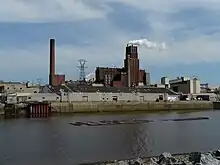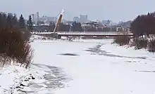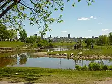 La rivière Saint-Charles dans l'arrondissement de Limoilou, avec en arrière-plan le centre-ville de Québec. | |