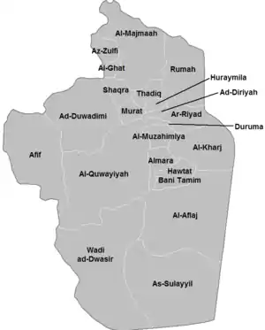 Outre la municipalité de Riyad, la province comprend 19 gouvernorats (muhafazat) et un sous-gouvernorat :