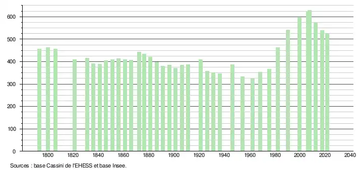 L'évolution du nombre d'habitants est connue à travers les recensements de la population effectués dans la commune depuis 1793. Pour les communes de moins de 10 000 habitants, une enquête de recensement portant sur toute la population est réalisée tous les cinq ans, les populations légales des années intermédiaires étant quant à elles estimées par interpolation ou extrapolation[35]. Pour la commune, le premier recensement exhaustif entrant dans le cadre du nouveau dispositif a été réalisé en 2007[36].