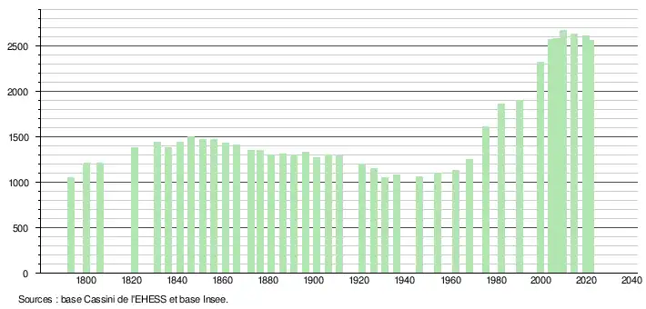 L'évolution du nombre d'habitants est connue à travers les recensements de la population effectués dans la commune depuis 1793. Pour les communes de moins de 10 000 habitants, une enquête de recensement portant sur toute la population est réalisée tous les cinq ans, les populations légales des années intermédiaires étant quant à elles estimées par interpolation ou extrapolation[26]. Pour la commune, le premier recensement exhaustif entrant dans le cadre du nouveau dispositif a été réalisé en 2004[27].