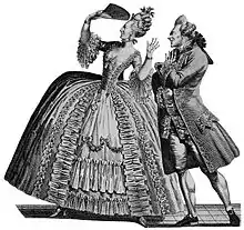 Sous la Régence (1715-1723), l'abbé Guillaume Dubois aurait rapporté de Londres la mode des paniers.La duchesse de Berry, fille aînée du régent, affectionne particulièrement cette tenue: la forme en cloche de l'ample robe à cerceaux dissimule en effet ses formes trop généreuses, valorisant ses chairs éclatantes, sa poitrine sculpturale et son visage malicieux [3]. Ces somptueux atours servent donc la grâce opulente de la jeune veuve mais l'aident surtout à cacher ses malencontreuses grossesses[4].