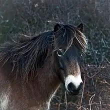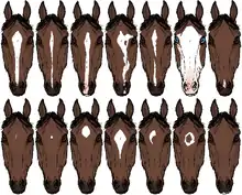 Le cheval peut présenter diverses marques en tête[21], suivant leur taille et forme, ces marques blanches portent un nom différent. L'en-tête est une tache de poils blancs sur le front du cheval. La liste est une trace verticale parcourant le chanfrein[22]. Le ladre est une dépigmentation des naseaux et de la bouche de l'équidé.