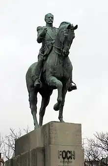 Dans la personnalité du Maréchal Foch (1851-1929) qui se distingua à la Marne et dans les Flandres en 1914 avant de diriger la bataille de la Somme en 1916 et de commander les troupes alliées en 1918 qu’il conduisit à la victoire, Wlérick et Martin tiennent à faire ressortir la personnalité du penseur militaire. Il est représenté tête nue et son air décidé n’aurait pas été visible avec le port du képi. Dans cette effigie s’exprime une interprétation glorieuse de la célèbre statue équestre de Marc Aurèle au Capitole de Rome, reprise par l’implacable Gattamelata de Donatello à Padoue. La simplicité des plans réduits au maximum, la cadence géométrique de la chevauchée prestigieuse s’affirment avec franchise et pureté dans l’attitude impérieuse du maréchal. « C’est Foch lui-même, avec son visage magnifique, distingué, volontaire et très humain ». Le socle de huit mètres de haut est conçu par les architectes Jean Carlu, Boileau et Azéma. L'animal choisi est un cheval d’armes au large poitrail, plus trapu que les purs-sangs qu’aimait monter Foch, mais le pur-sang ne convenait pas à la masse d’un monument aux proportions aussi gigantesques.