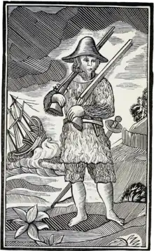 - Robinson Crusoé : personnage de fiction créé par Defoe. Celui-ci le fait naître à York en 1632 d'un père, originaire de Brême et d'une mère de la famille Robinson, une des meilleures de la province d'où son double nom de Robinson-Kreutznaer. Defoe nous explique que par une corruption de mots, assez commune en Angleterre, ce nom devint Robinson Crusoé. Troisième fils de la famille, son père voulait en faire un avocat. Mais le désir de Robinson était de partir en mer. Malgré l'interdiction de ses parents, il partit sur un bateau pour Londres le . Durant cette première navigation, le bateau fut pris dans une terrible tempête et sombra. Enfin arrivé à Londres, il rencontra un capitaine de vaisseau avec qui il partit vers la côte de Guinée. Capturé par des corsaires de Salé, il fut réduit à l'esclavage. Il s'échappa, après deux ans de captivité, et à la suite d'une longue navigation il arriva à la baie de Tous les Saints au Brésil. Il y devint planteur de tabac. Au bout de quatre ans, associé à d'autres planteurs, il partit sur un vaisseau afin de se procurer des esclaves. Après douze jours de navigation, il fut complètement désorienté par un ouragan. Le navire fit naufrage près d'une île aux environs de l'Orénoque. C'est le début de son long isolement. Au physique, Robinson était roux, assez grand, habillé de vêtements déchirés après son naufrage. Il était assez foncé mais pas noir et il avait des cheveux mi-longs. Sa lecture de la Bible, son attention aux signes de la providence, sa religion personnelle expriment le protestantisme de son auteur et de son époque[6].