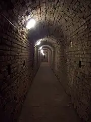 À l’issue du couloir, un long escalier rectiligne de 42 marches mène : à droite, au courtil sud et sur la sortie du musée et à gauche, sur deux petites salles de la tour d’angle et ses deux canonnières.